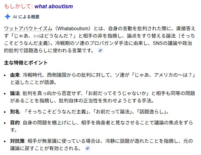 サルには、波浪警報の時に船を出す船長と、差別主義者の気狂い思想で自衛隊を汚染させて、1国の大使をナイフ持って襲い始める事態になったことが同列の問題、どっちもどっちとか思うらしい。サルのキチガイさもここまでくるとすげぇな、と。ぷろぐらむでいえば、心肺監理しすてむでぬるぽバグで停止しちゃった♪って馬鹿なぷろぐらまと、相手の人種、思想で攻撃してくるろぼっと作っちゃった♪レベルの違いを感じるが、サルにはこの違いが一生理解することはねぇんだろうなぁ。 https://pbs.twimg.com/media/HEPWQA5a8AA_2pG.jpg 「自衛隊の件でネトウヨガーとか言うてくる奴らは、てめぇらの支持してる政党支持者が波浪注意報出てるのに、乗客を無保険の船舶に乗せて事故を起こして最悪の事態を招いたのにはなんもいわねぇんだ?」 https://x.com/Dongurihou/status/2036608432829292796 「山上を左翼に唆された政治的テロリスト呼ばわりした人間は、今回何を言われても文句言うななんだよな。 あと幼稚なwhat aboutイズムは見苦しい。」 https://x.com/placebo_fab/status/2036663147382415724 「whataboutism止めてね✋ 普通にどっちもゴミカスなんだから誤魔化そうとすんなよ」 https://x.com/RJiXAGkTSd55390/status/2036683820259553373 「沖縄の件は痛ましい事故。中国大使館の件は歪んだネトウヨ思想が招いた事件」 https://x.com/II37302844/status/2036679493008695554 「両方終わってると言ってるのにね これだから ネトウヨは…😅」 https://x.com/Fuji_4brothers/status/2036683981132025924 「ネトウヨインフルエンサーを球団するなら、サヨク言論人もアウトやで。 抗議船で燃えてる中で無理筋にネトウヨ批判してはコレは言われるよ。」 https://x.com/jumpingcarp/status/2036617884462678331